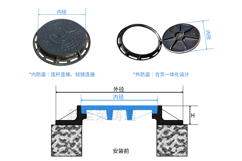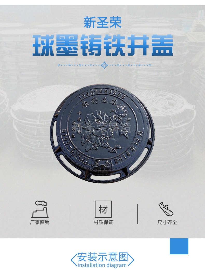 昌邑球墨鑄鐵井蓋優點: 1、壽命長:耐腐蝕,無污染,免維護,可以使用50年以上。 2、承載力高:承載力遠超其它種類產品,承載壓力大,防斷裂、車輛墜落等安全事故。 3、防盜:普通防盜設計、新型防盜設計,井蓋和井圈采用高強螺栓連接,一體設計。 4、安全性好:不會產生跳、蹺、移位等現象,無噪聲、安全可靠。